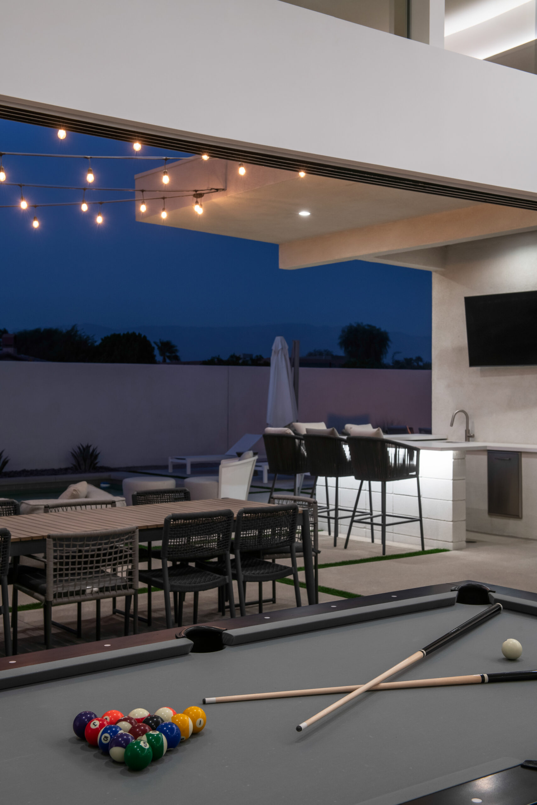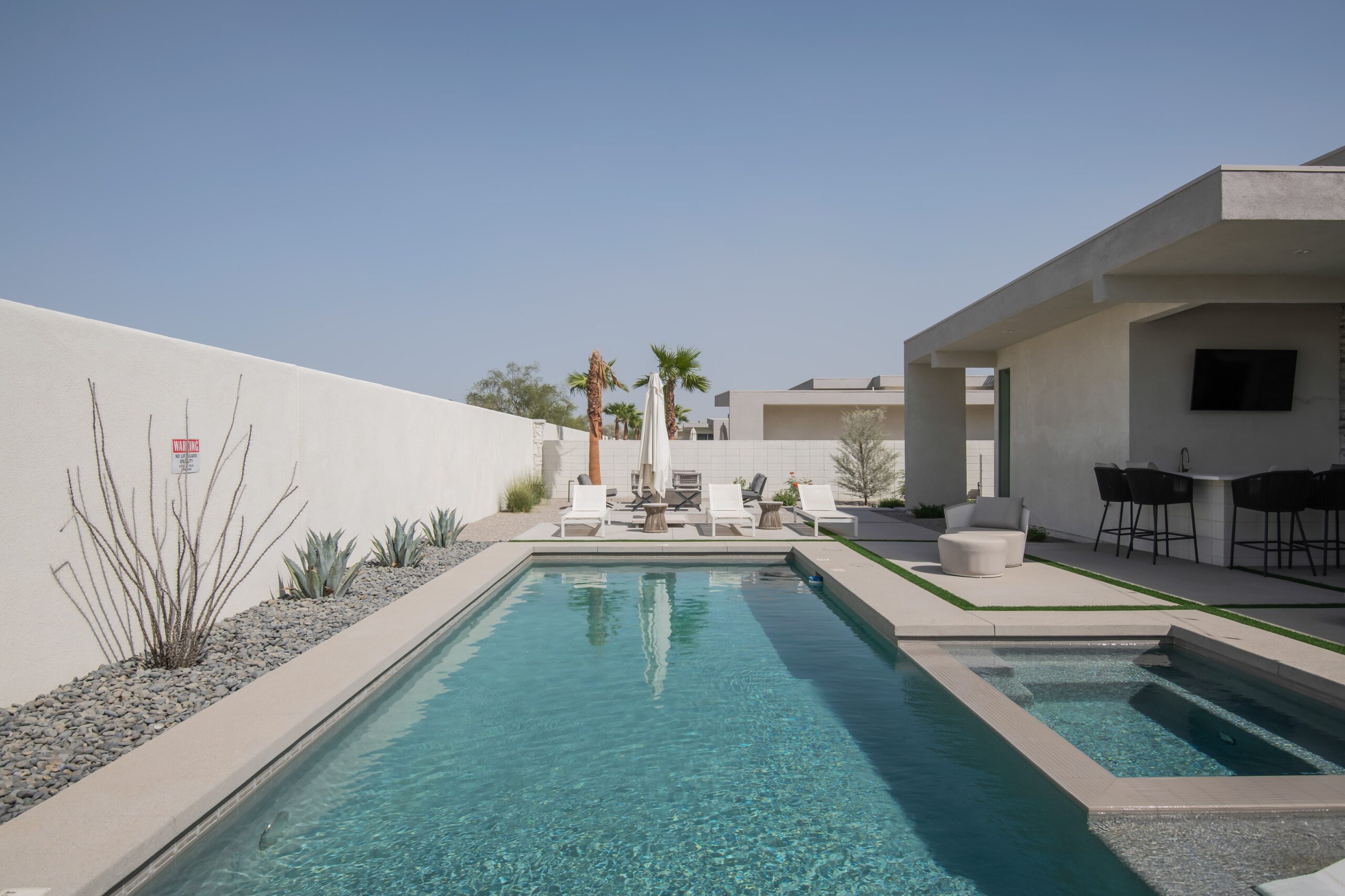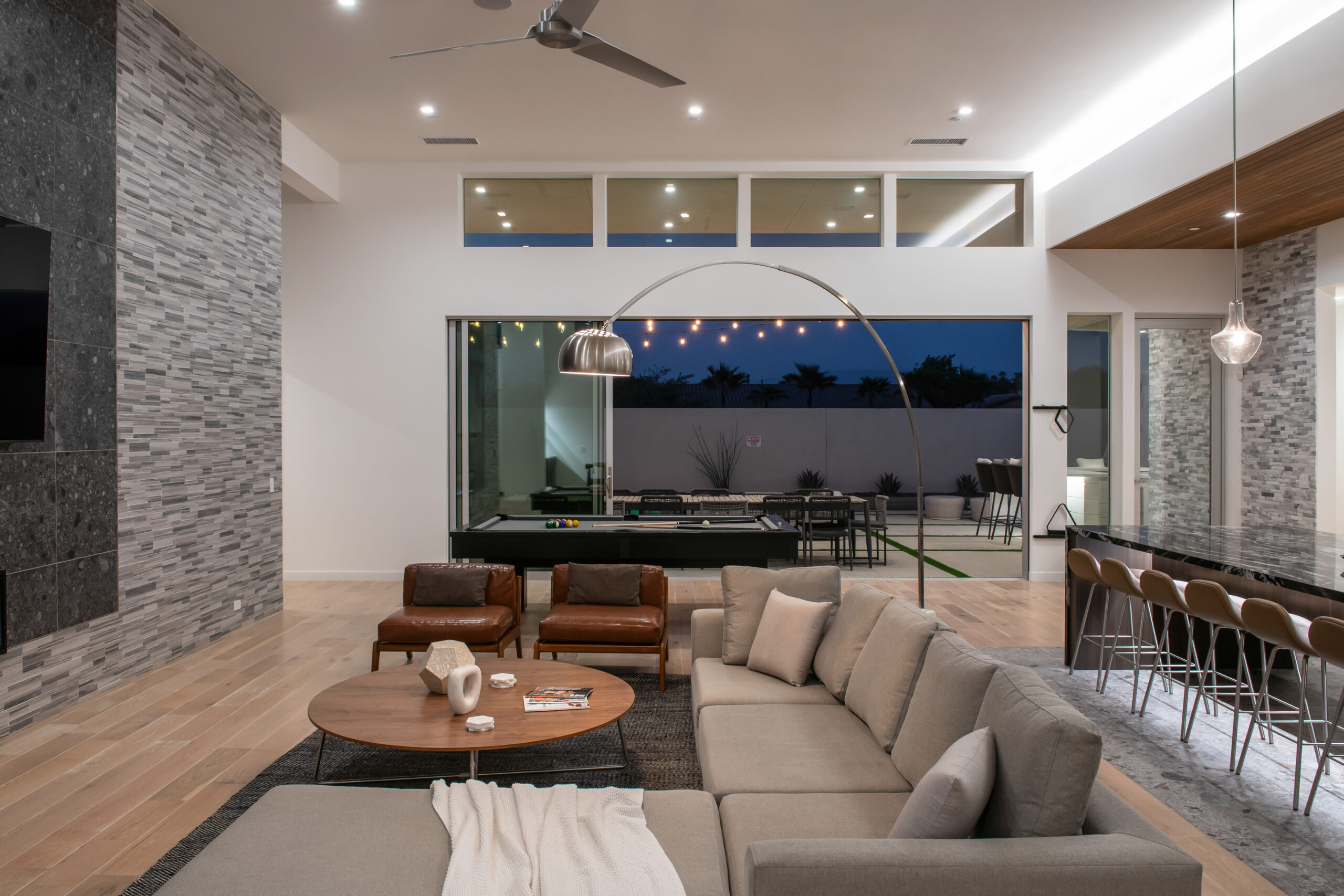 Mercury House contemporary aesthetic extends from the sophisticated interiors to the stunning outdoor entertainment area, featuring a custom pool, ambient firepit, and bocce ball court. Multiple conversation areas and dining options provide versatility for different group activities.